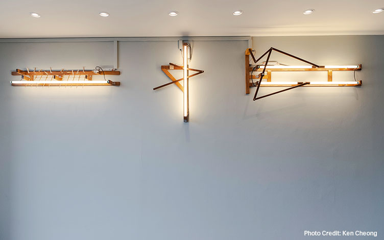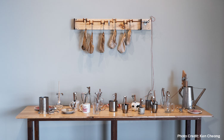 In Sensory Anchors, Yang Jie draws attention to the occurrences that take place around us. These could be sounds heard at the local coffee shop as people have their morning breakfast, the ticking of a clock, or lights that turn on as evening approaches. Through a series of kinetic sketches, he recreates abstractions of movements characteristic of these scenes and everyday moments. These sketches are assemblages comprising various materials, including readymade objects commonly found in Singapore. This medley of sketches takes on a life of its own, either performing gestures autonomously or reacting to their surroundings.